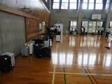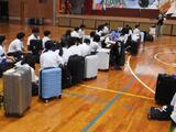 雨の中2年生はスーツケースを持って体育館に登校です。