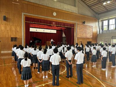 各学年と生徒会の代表から2学期の抱負が述べられました。そして校長からはパリオリンピックで金メダルを取った選手の「無駄な努力はない」というインタビューと「勇気と挑戦」について話をしました。